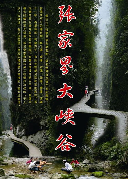 早7-8點(diǎn)左右市區(qū)定點(diǎn)集合點(diǎn)集合,游覽【張家界大峽谷】峽谷間是一條清幽的小溪,沿溪邊是用木板搭建的游道, 張家界大峽谷峽谷內(nèi)不僅有傳統(tǒng)的秀美自然風(fēng)光,還云集有三朝數(shù)代的歷史人文景觀,如記錄李自成與吳三桂慘烈決戰(zhàn)的“千人墳”古戰(zhàn)場(chǎng),反映湘西歷史特色的土匪洞及見(jiàn)證解放初期湘西人民靠天勞作在絕壁間挖鑿的“南方紅旗渠”等。 |